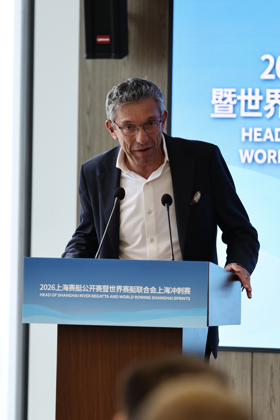 天下赛艇聚合会竞赛委员会委员兼亚洲首席发展内行克里斯·佩里——新民晚报记者李铭珅、实习生岑佳宁摄