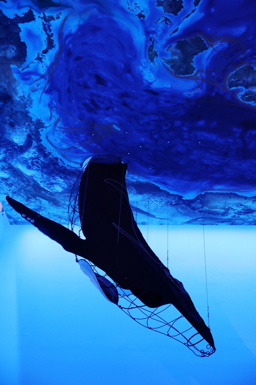 展览还终点在地下一层摆列了密密的“幽魂网”,行为“鲸鱼的请安”繁衍装配。这是凯塞多与上海多所学校学生共创完成的,以烧毁渔网为主要材料,通过剪裁、缠绕、打结与衔接,将渔网与拣到材料一同固定、组合,渐渐酿成数件体量相反的雕琢作品,破损环境的留传物由此转化为温和与督察的标志。