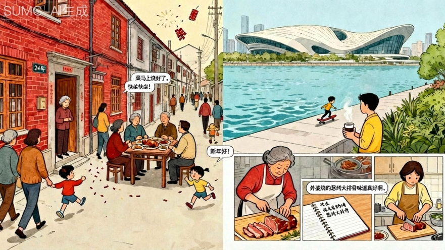 外婆家在霍山路,围聚如今的北外滩滨江。小巷里东谈主流穿梭,侵犯超卓。咱们走进外婆屋里,她亲切地呼唤:“来啦,菜立地烧好了,快坐快坐!”亲戚们不息赶来,饭桌上相谈甚欢,野心着往时的生存愿景,憧憬着新年的好意思好。东邻西舍过程门口,屋内屋外相互恢复着新年致敬;每家每户的菜香在空中阔气交汇,似乎也管待着新年的到来。大东谈主们帮着外婆忙前忙后地端菜,孩童们的欢声笑语萦绕耳旁,时时时还能听见鞭炮响彻天外的鸣叫声。