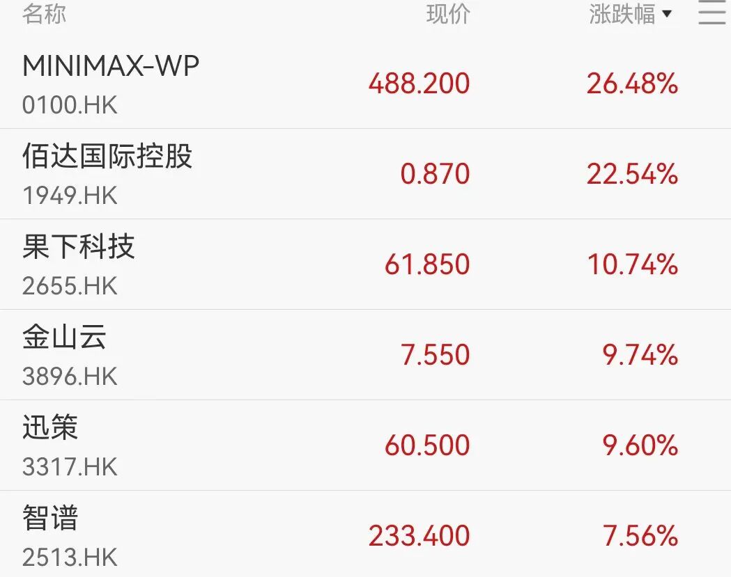1月27日,截至港股收盘,ai应用概念大涨,MINIMAX-WP涨26.48%,智谱涨7.56%,阿里巴巴涨幅近3%。