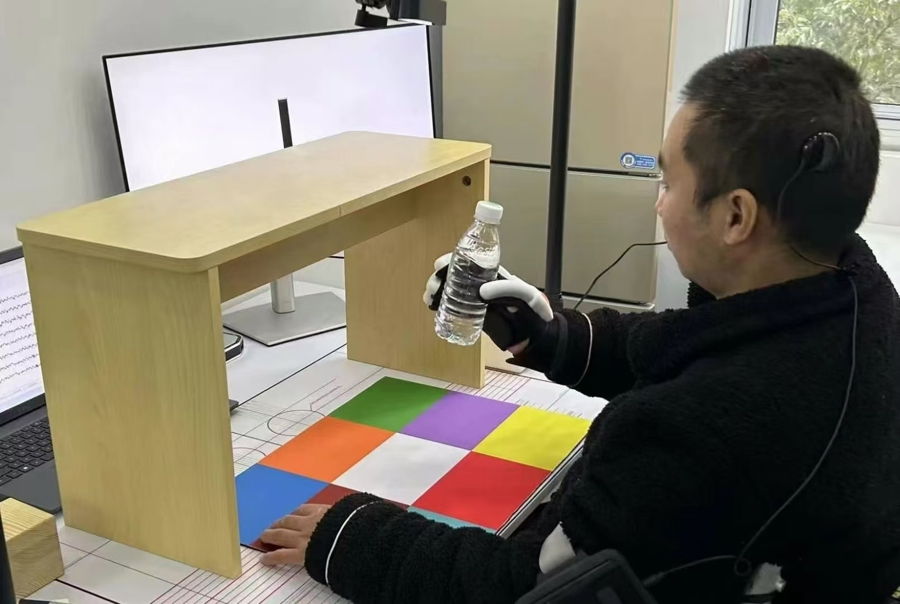 瘫痪患者植入博睿康研发的脑机接口居品后,可抓执水瓶喝水。