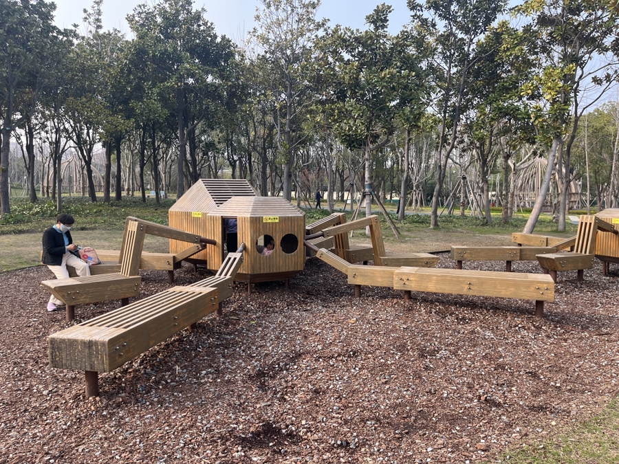 “蜘蛛休息站”内,伸出的木质“长脚”即是一条“长椅”,镂空的“形体”里面空间则通俗孩童去玩耍探索