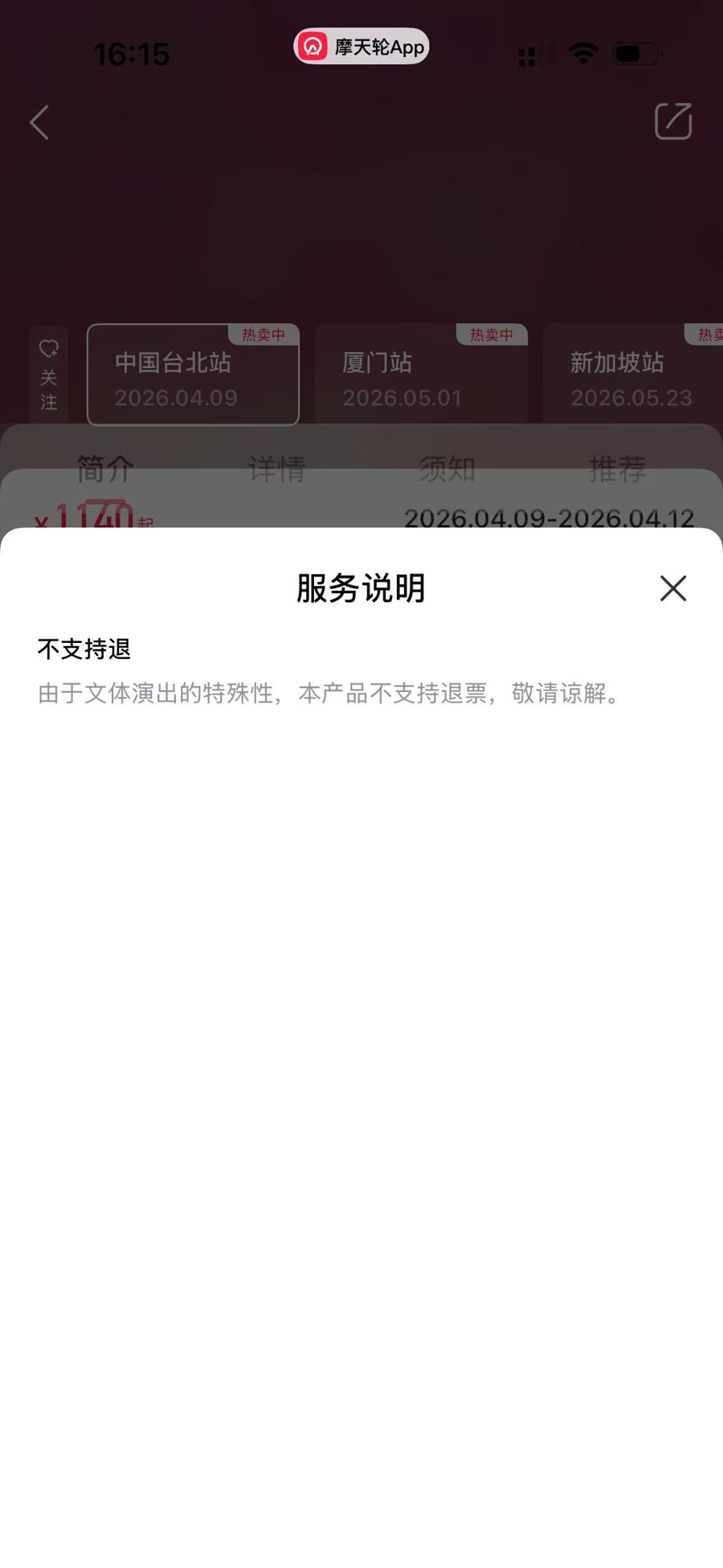 记者登录“摩天轮”App,找到了欣欣所购买的4月9日邓紫棋台北大巨蛋演唱会信息,平台败露该场次演唱会门票仍处于“热卖中”,页面退票治安败露为“不赈济退”,点击“做事讲明”后弹出一滑小字:由于体裁献技的疏淡性,本产物不赈济退票,敬请饶恕。