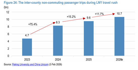 如若说商品消费的回暖更“结构化”,那么管事消费里最具敬佩性的依然出行。好意思银拜访裸露,春节出行意愿全面上行:国内短途出行接洽占比升至36%(客岁2月25%),赴港澳接洽升至21%。摩根大通也援用机构预测称,春运跨县非通勤出行或达到106.8亿东谈主次(同比+11.7%)。