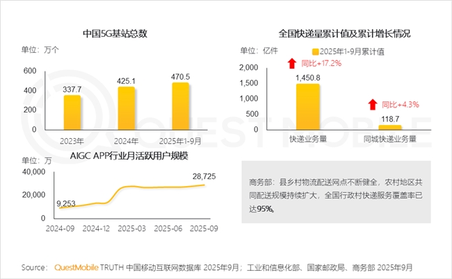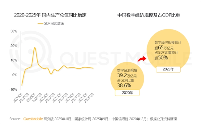 QuestMobile数据显示,2025年是中国数字经济从“量变”转向“质变”的关键分水岭,预计全年数字经济规模将超65万亿元,占GDP比重突破50%,正式成为国民经济的核心引擎。