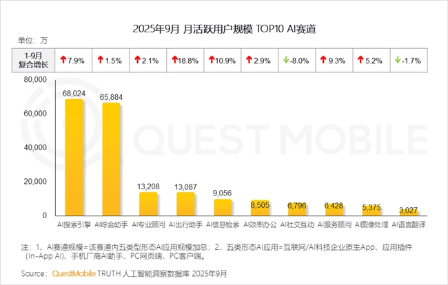 QuestMobile数据显示,自2024年9月起,一年内六大手机厂商AI助手规模合计增长6500万,同比增长13.9%。