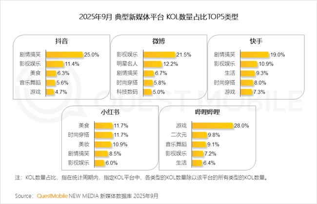 3.2 新媒体平台具有独特的“内容基因”,抖音、快手剧情搞笑和影视娱乐内容占主导,微博成为粉丝与话题广场,小红书的美食、时尚、美妆内容构成精致生活指南,哔哩哔哩的游戏和二次元文化构筑其核心壁垒