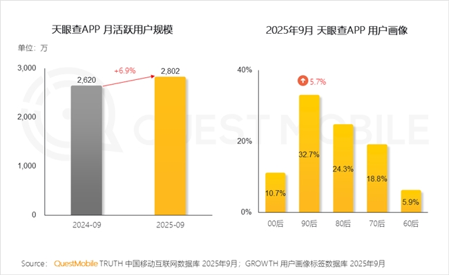 QuestMobile数据显示,截止2025年9月,天眼查APP月活跃用户规模达2802万,同比增长6.9%,核心用户群体高度聚焦于90后,其活跃占比达32.7%,同比提升5.7%。