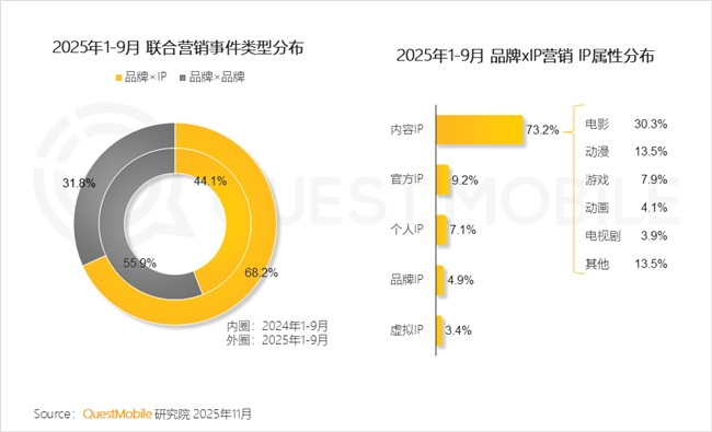 QuestMobile数据显示,2025年1-9月联名营销事件中,品牌与IP联名的占比同比增加24.1个百分点。