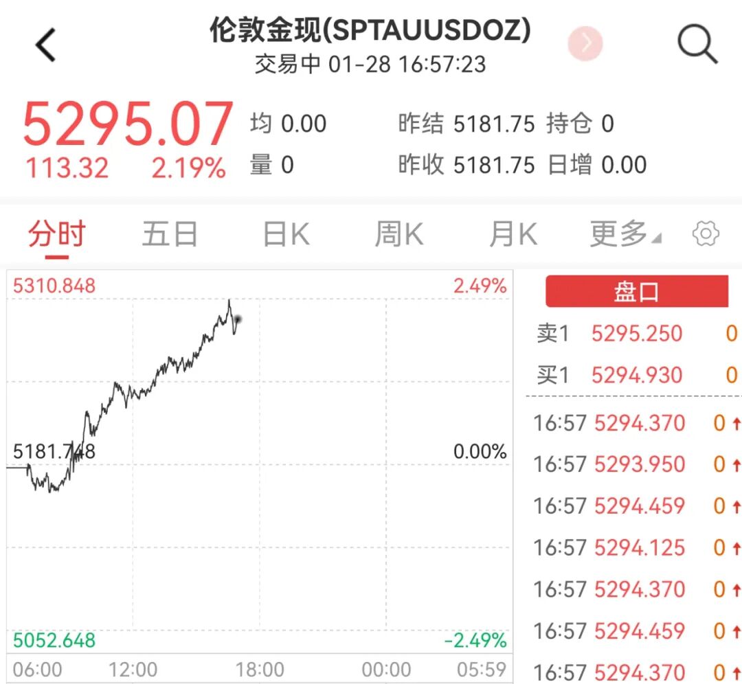 1月28日午后,现货黄金涨破5300美元/盎司,续创新高。截至发稿报5295.07美元/盎司,涨超2%。今年以来,现货黄金价格累计涨幅已超22%。