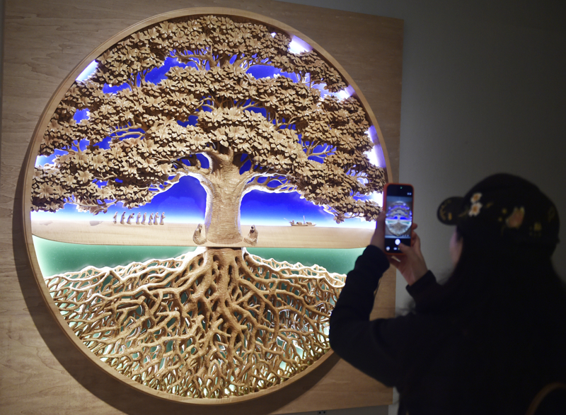参不雅者在中国好意思术馆拍摄展出的木雕展品《生万物》。新华社记者 鲁鹏 摄