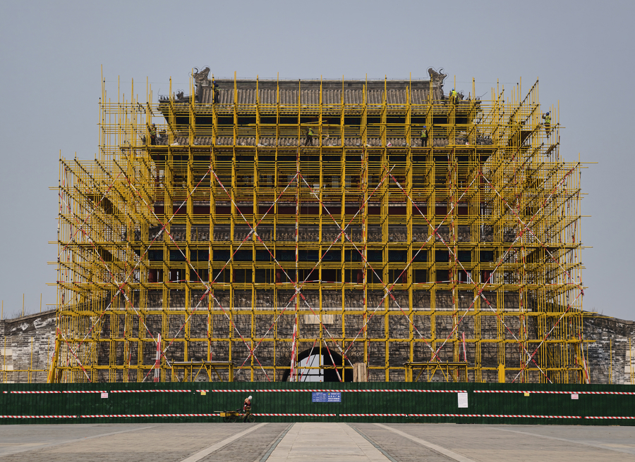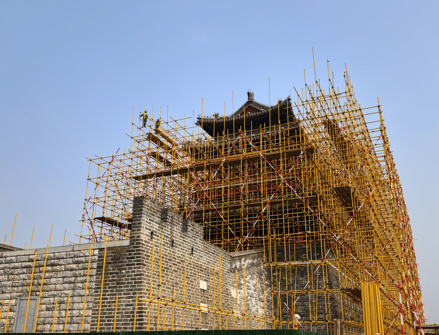 永定门城楼修缮工程正在进行,工东说念主搭起脚手架,准备进行建筑修缮。