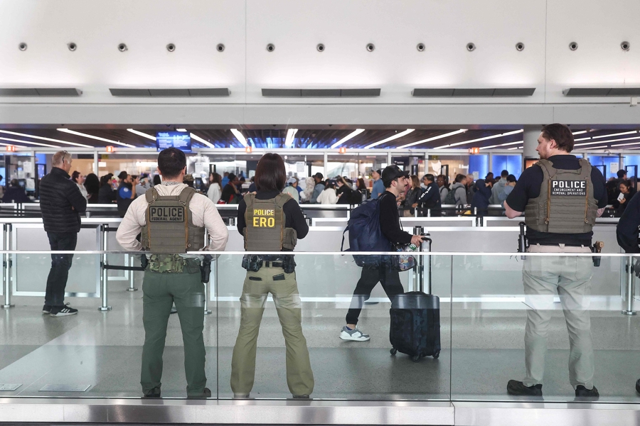 侨民与海关端正局的端正东说念主员在好意思国纽约拉瓜迪亚机场的开赴安检处执勤。新华社记者 张凤国 摄