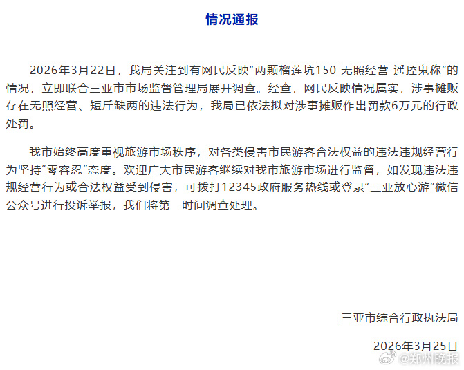 富灯网配资今天(3月25日),三亚市概括行政划定局发布情况通报: