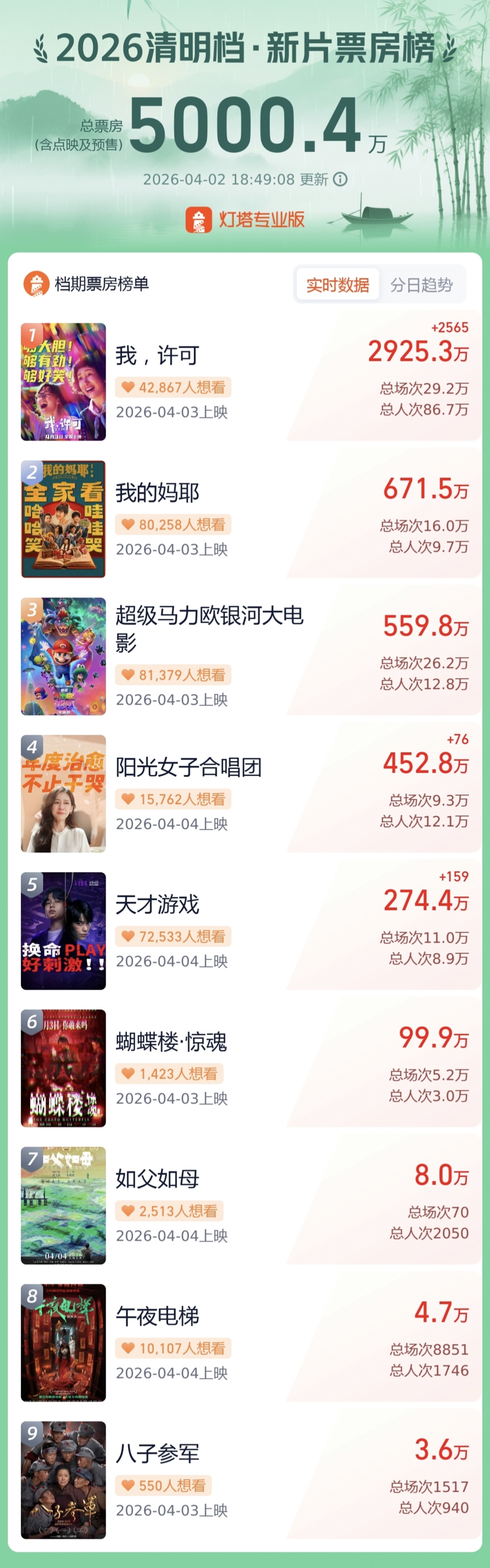 2026年辉煌档再现“小片扎堆上”阵势。本年共有18部影片定档辉煌档,有9部都是小成本恐怖片。另一方面,庞杂与亲情、友情关连的电影点映口碑不俗,撑起辉煌档的紧要声量。据灯塔专科版统计,胁制4月2日18时49分,2026年辉煌档新片点映及预售总票房打破5000万元,影片《我,许可》《我的妈耶》《超等马力欧星河大电影》《阳光女子齐唱团》《天才游戏》暂列前五。其中《我,许可》预售票房超2900万元占比过半。影片聚焦母女关系话题,女性想看占比高达93.2%。