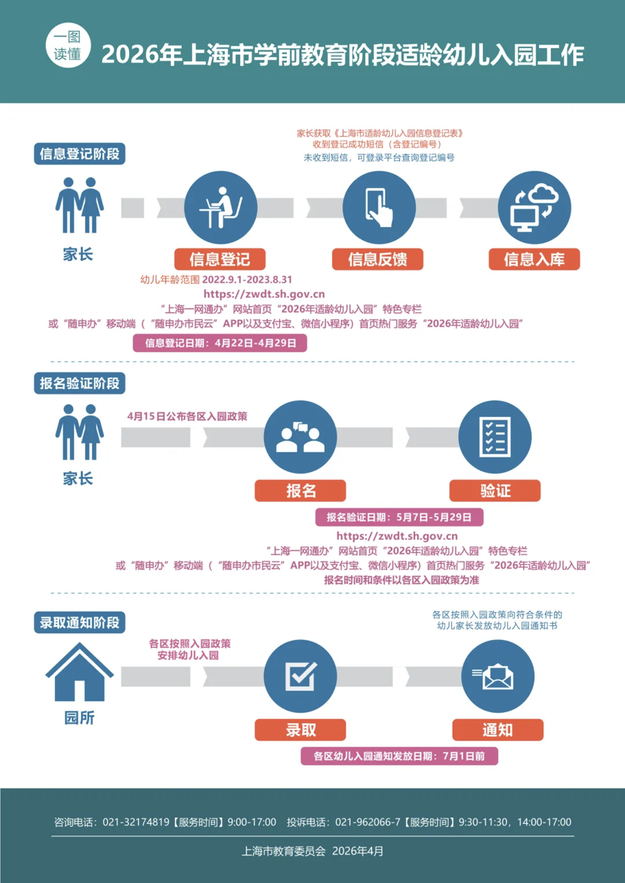 一是信息登记阶段:4月15日,各区公布适龄幼儿入园计谋。4月15日—4月21日,挑升愿的幼儿园可通过多种神志开展园所洞开日活动。4月22日—4月29日,适龄幼儿监护东说念主进行幼儿网上入园信息登记。4月22日中午12∶00,“上海一网通办”网站(https://zwdt.sh.gov.cn)首页“2026年适龄幼儿入园”性情专栏,及“随申办”移动端首页热点功绩“2026年适龄幼儿入园”模块将认真灵通。