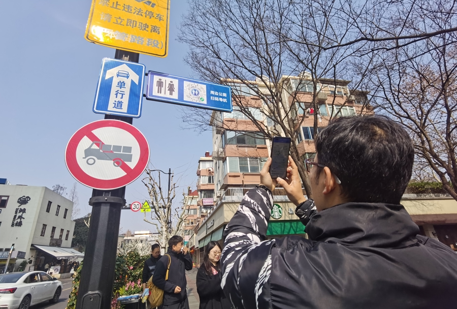刘佳悦扫描路杆上的二维码。 陈玺撼摄
