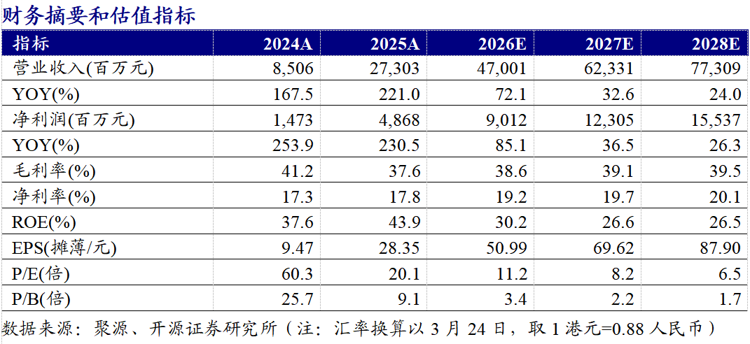 公司发布功绩公告:2025年营收273.03亿元(同比+221.0%,下同)、归母净利润48.68亿元(+230.5%),同期展望2026年一季度已毕营收165-175亿元、归母净利润36-38亿元。探讨公司销售需求蓬勃、渠谈数目增长、品牌势能进步,咱们上调2026-2027年并新增2028年盈利预测,展望2026-2028年归母净利润为90.12/123.05/155.37亿元(2026-2027年原值72.00/94.96亿元),对应EPS为50.99/69.62/87.90元,现时股价对应PE为11.2/8.2/6.5倍,督察“买入”评级。